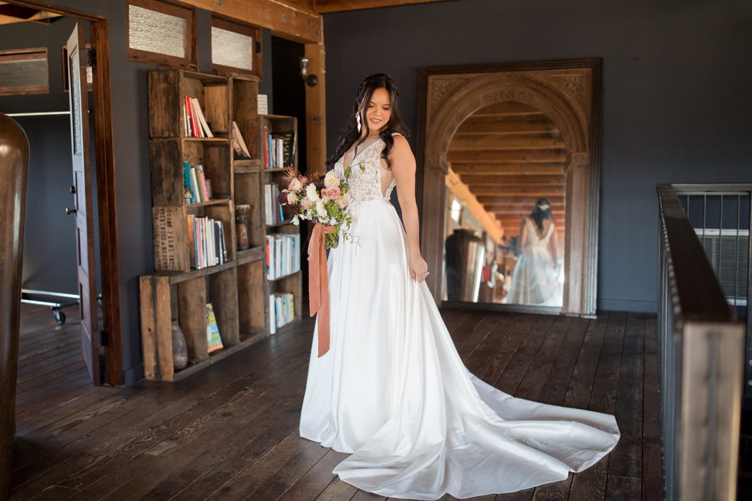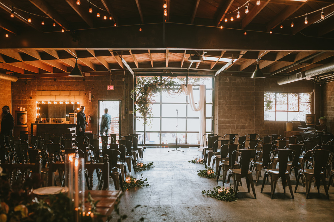 The boys in blue gathered outside Smoky Hollow Studios to pose for group photos while the girls were inside getting the bride excited for her big reveal. The bride, Crystal, was dressed in a stunning a-line wedding gown with lace bodice, and each of her bridesmaids wore different colored dresses that all complemented one another. The groomsmen wore matching maroon ties, brown shoes and blue suits. Rey, the groom, wore a lighter blue suit to stand out from the group. Together, the group lined up and awaited their grand entrance into the ceremony.