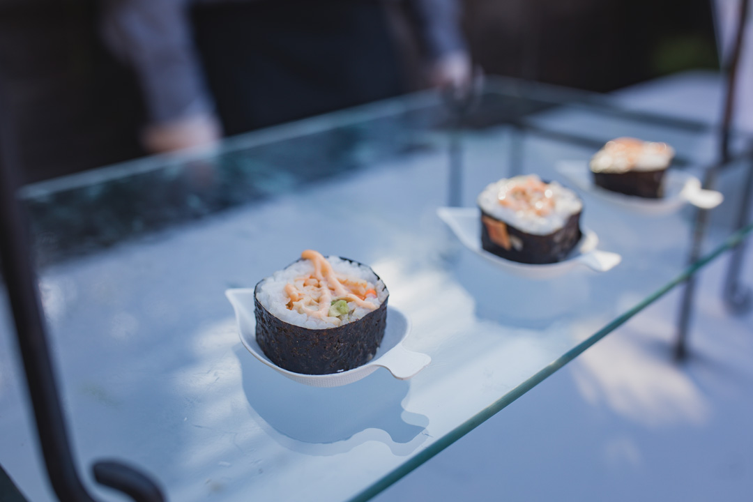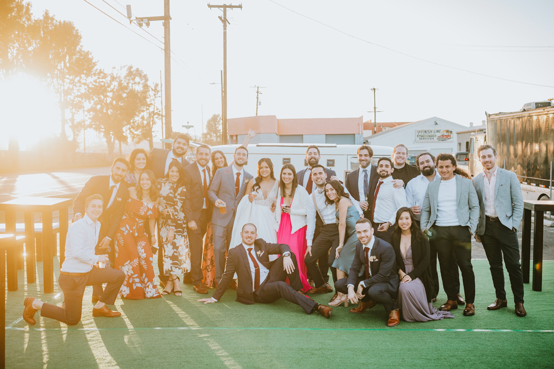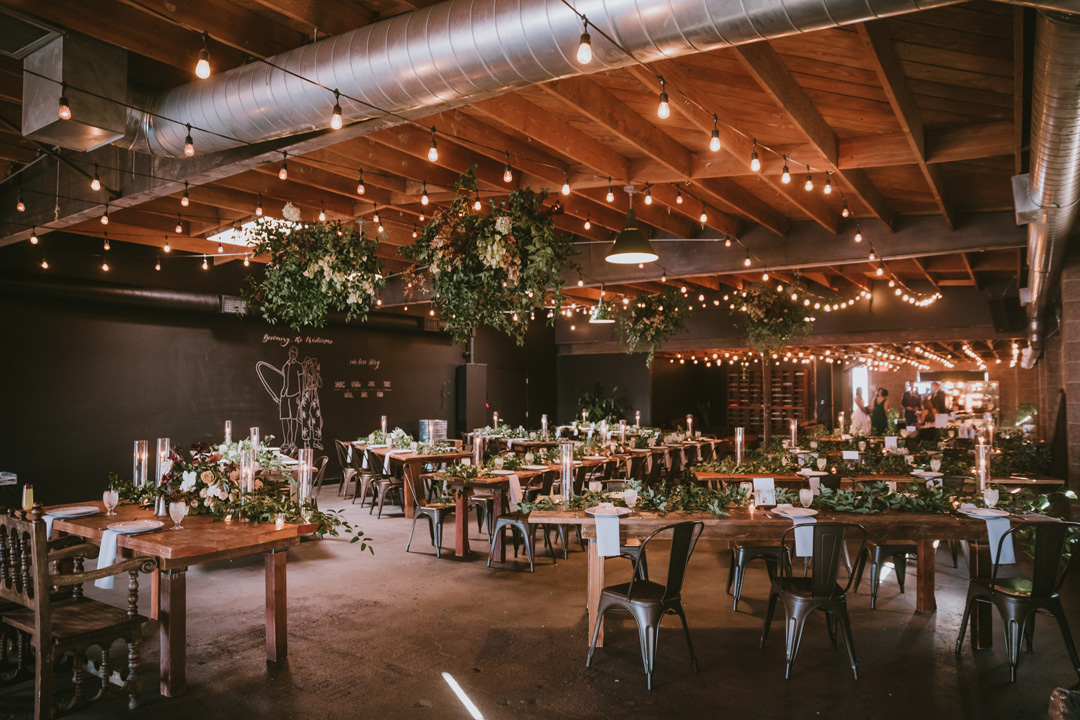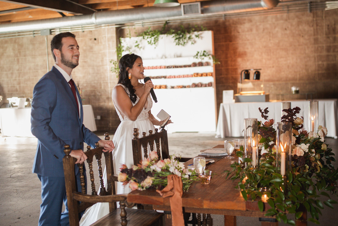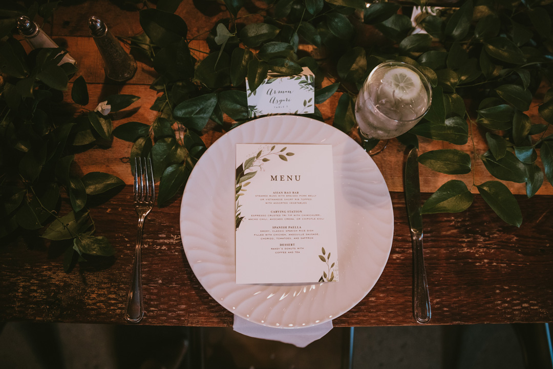 Outside, our hors d’oeuvre Fusion Station was serving up California Rolls, Thai Vegetable Spring Rolls and Beef Empanadas to hungry guests. A beverage bus had a selection of drinks on tap and guests mixed and mingled enjoying sharing stories about the newlyweds. Crystal and Rey soon joined their friends and family outside for cocktail hour just before heading back inside for dinner. Back inside, rustic tables mixed with industrial chairs for the reception. Greenery and candles topped each table and every plate had a dinner menu placed atop of it so guests would know what they could expect for their next meal. As soon as everyone found their seats, the bride and groom entered into their first dance, then thanked everyone for joining them on their special day. While toasts were shared with the room, dinner was made available. A selection of Espresso Crusted Tri Tip, Paella, Vietnamese Braised Short Rib with Asian Cucumber and Bar Bar Stations were visited by each table. Our Event Specialist, Rachel, along with Crystal and Rey, pre-selected the menu during the planning process for the wedding based on the couple’s tastes and thoughts of what their guests would enjoy. The menu was an absolute hit and some people even went for seconds. After dinner, the newlyweds surprised their guests with a fun donut display for dessert before ending the evening.