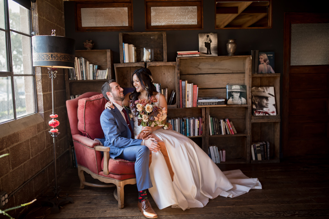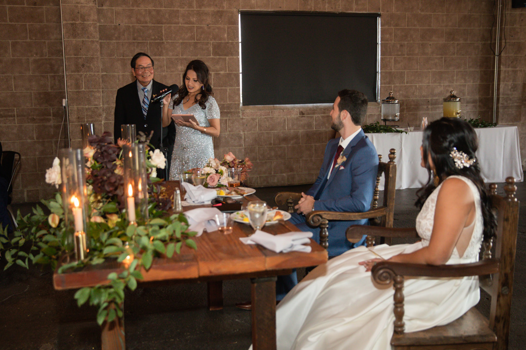 Inside Smoky Hollow Studios, a beautifully draped arbor stood tall as Crystal and Rey’s ceremony backdrop. Rust and blush colored flowers decorated the left corner of the ceremony backdrop and candles wrapped in greenery lined the aisle. Once everyone was seated, the bride and groom made their entrances and stood in front of family and friends as they exchanged handwritten vows and rings. Their officiant pronounced them husband and wife, then the two cheerfully exited the ceremony space to take a few photos together before heading to cocktail hour.