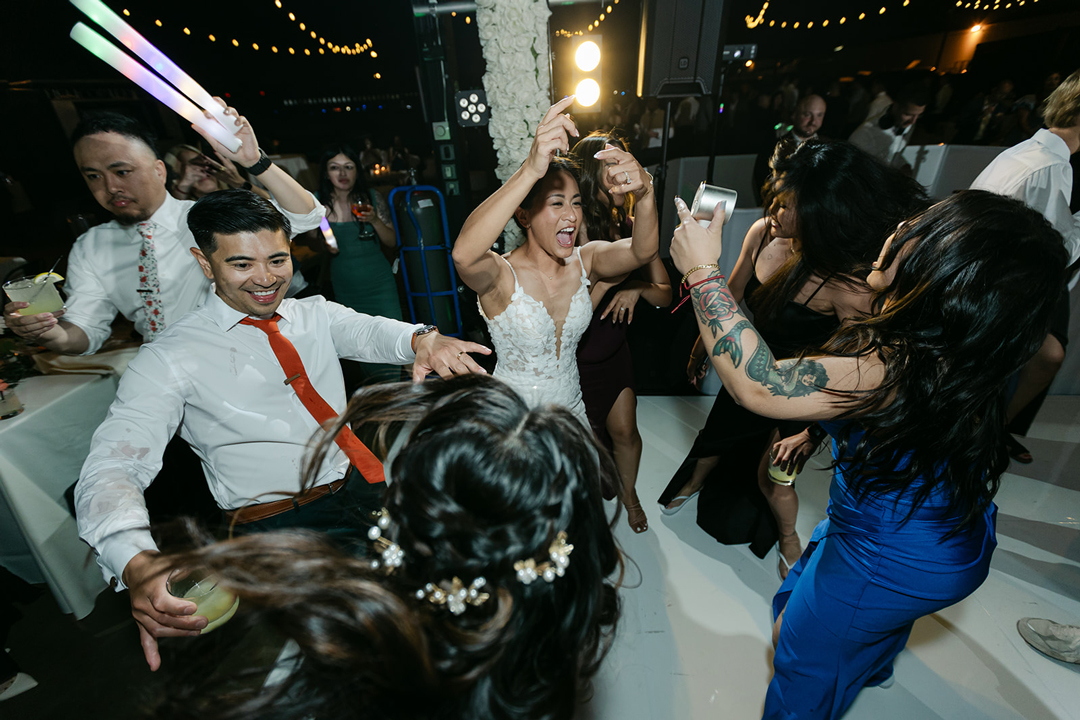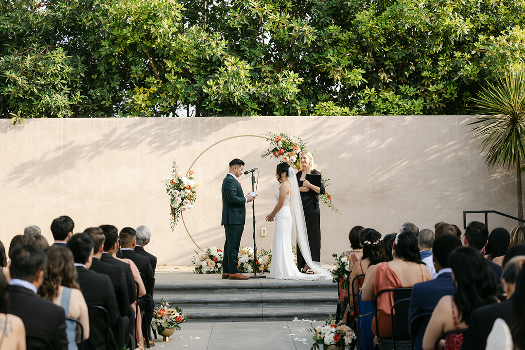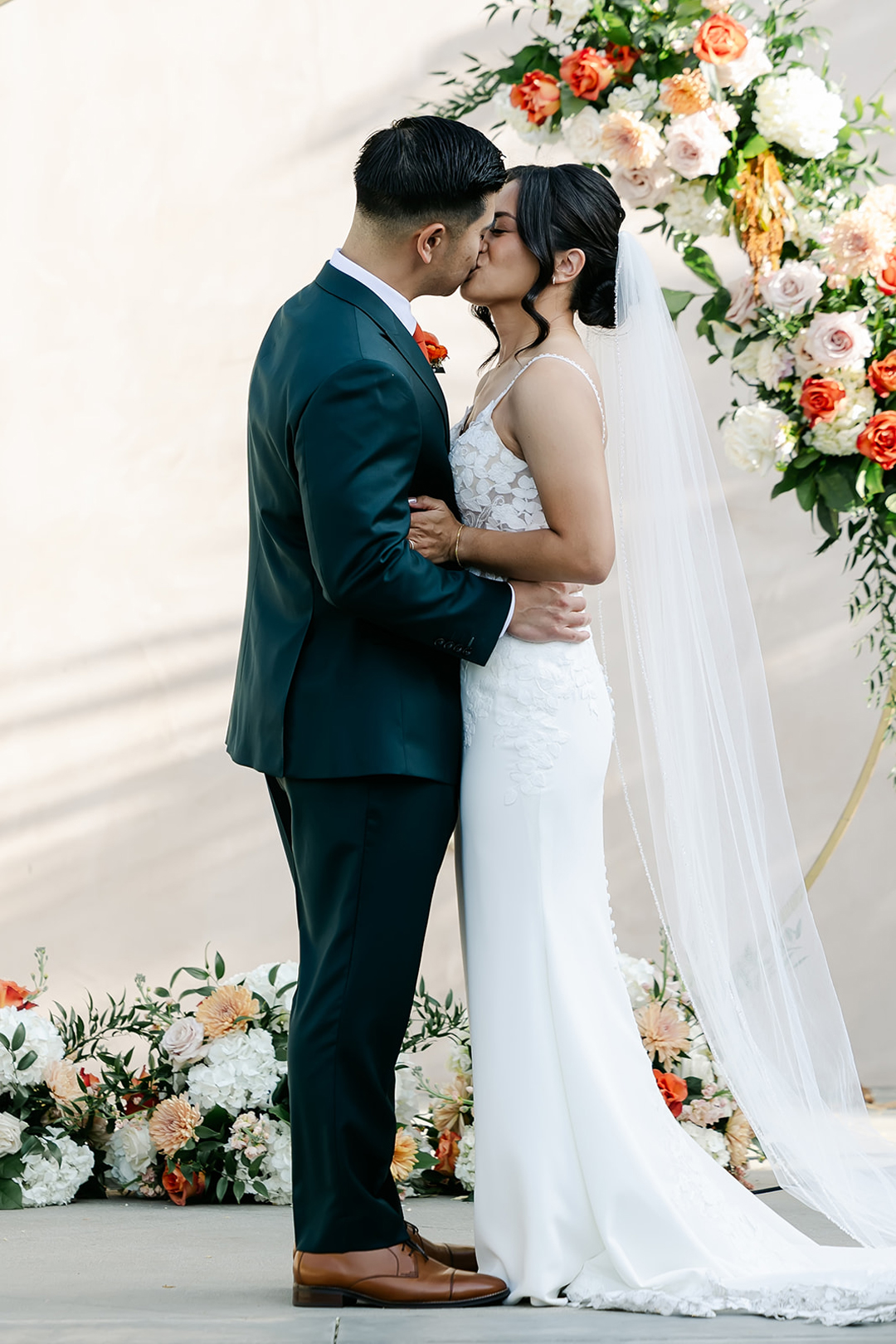 Guests entered the side patio, signed the bride and groom’s guest book, then took a seat. Orange, blush, and white flowers lined the aisle and decorated the stage. Once everyone was in attendance, the music cued up and the wedding party made their entrances. In front of all their closest friends and family, Katrina and Francis shared their vows, exchanged rings, and sealed the ceremony with a kiss.