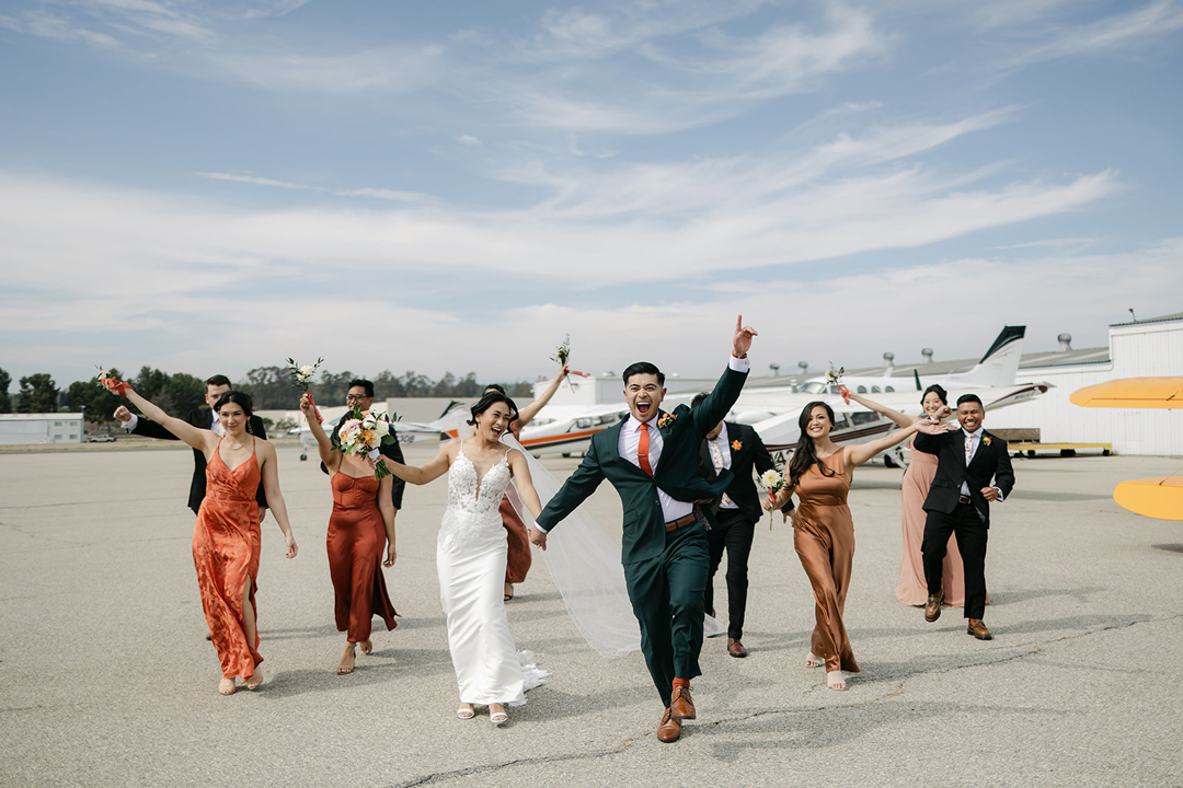 Katrina met Francis outside of Hangar 21 for their first look. On the photographer’s signal, Francis turned around to see his beautiful bride standing before him in a lace detail wedding dress and smiles immediately filled their faces. Sweet compliments were exchanged, then the couple joined their wedding party on the tarmac for group pictures. The bridesmaids were dressed in peach, orange, and tan, and the groomsmen wore black. Together the friends smiled for the camera creating lasting memories, then lined up for the ceremony.