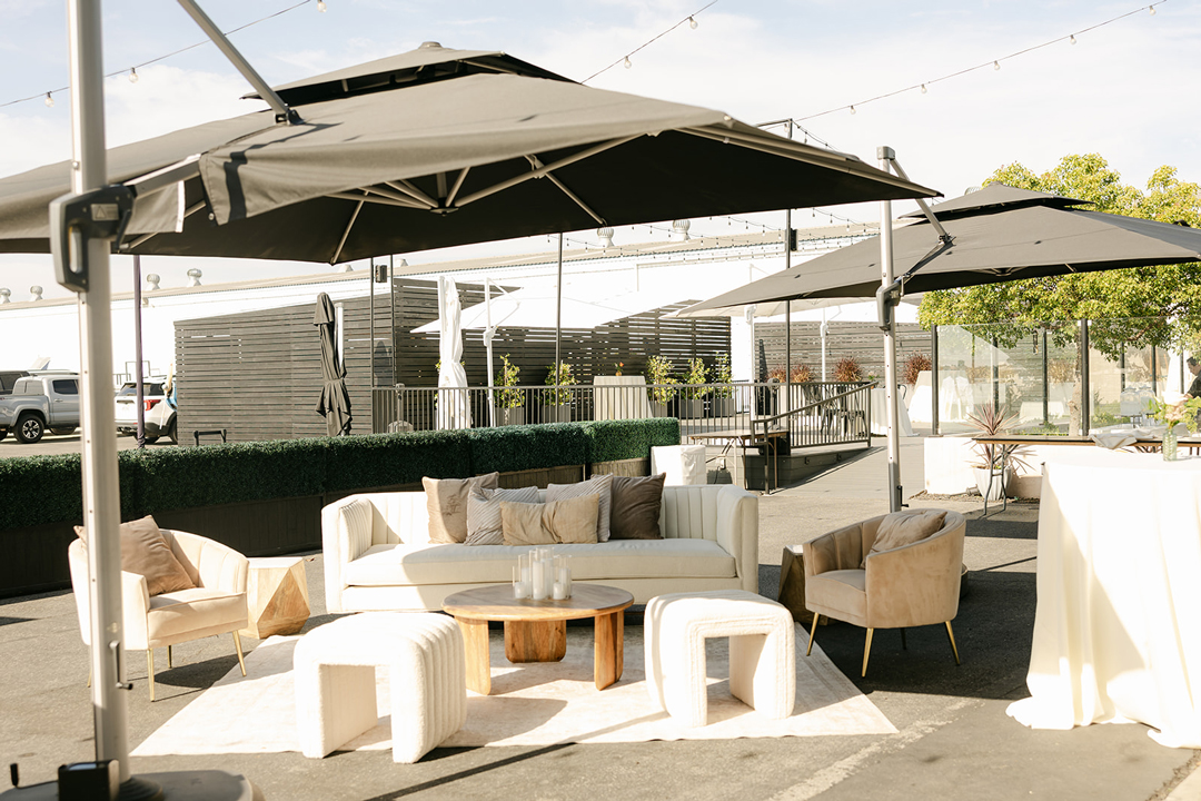 Filet and Wild Mushroom Wellingtons, Seared Ahi on Wonton Chips, and Fig, Goat Cheese and Mascarpone Tarts were tray passed around the tarmac while the bar served up Aperol Spritz and Pineapple Margarita signature drinks. White and taupe-colored lounges were situated on either side of the tarmac for guests to sit back and relax while watching small planes take off and land. Everyone mixed and mingled until it was time to head into the hangar for the reception.