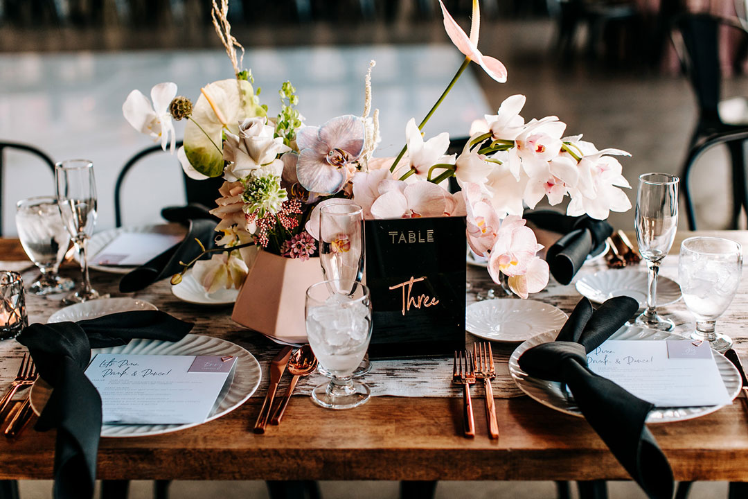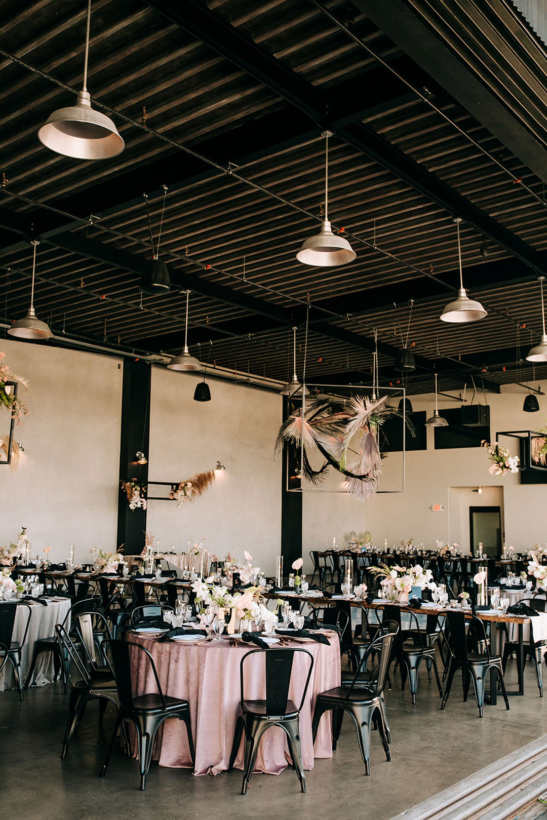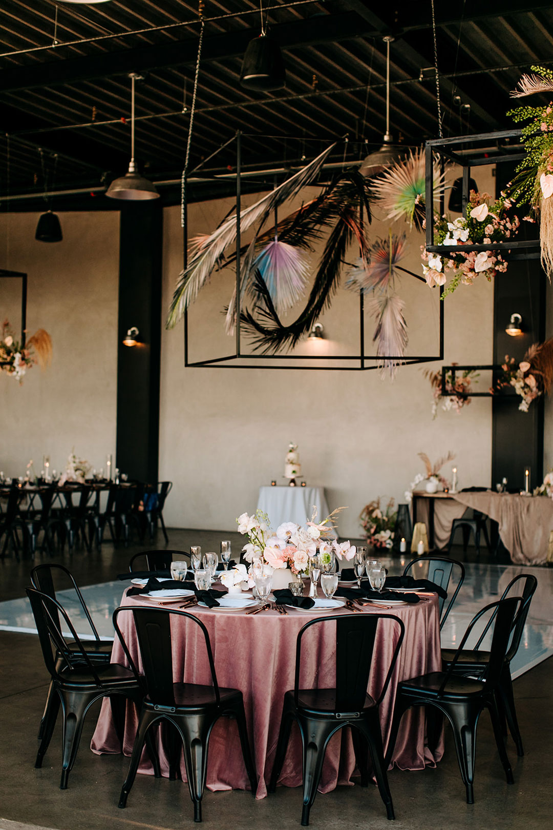 Cherisse and Candido’s wedding reception was quite the extravagant event at Hangar 21 South. Black details with pops of champagne and light pink transformed the hangar into a stunning, romantic space. Orchids, ranunculus, anthurium and roses graced each tabletop while painted palms of purple, blue, green and pink hung above. It was like nothing we have seen before but had us swooning!