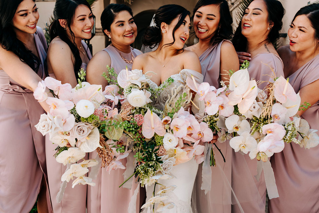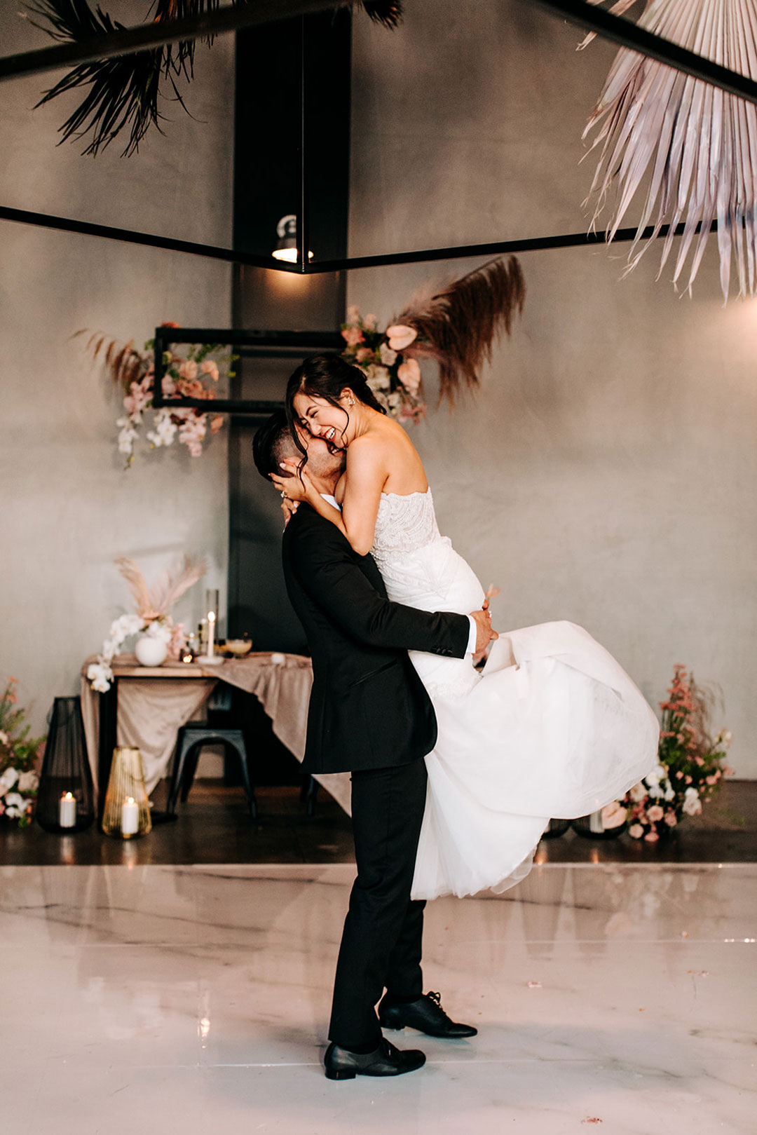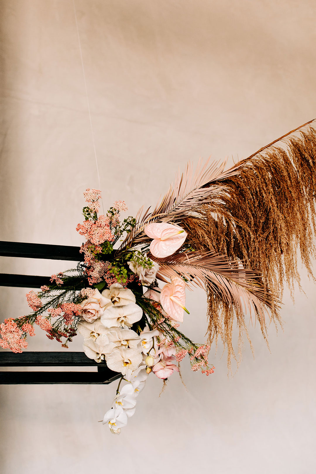 Cherisse and Candido’s wedding reception was quite the extravagant event at Hangar 21 South. Black details with pops of champagne and light pink transformed the hangar into a stunning, romantic space. Orchids, ranunculus, anthurium and roses graced each tabletop while painted palms of purple, blue, green and pink hung above. It was like nothing we have seen before but had us swooning!