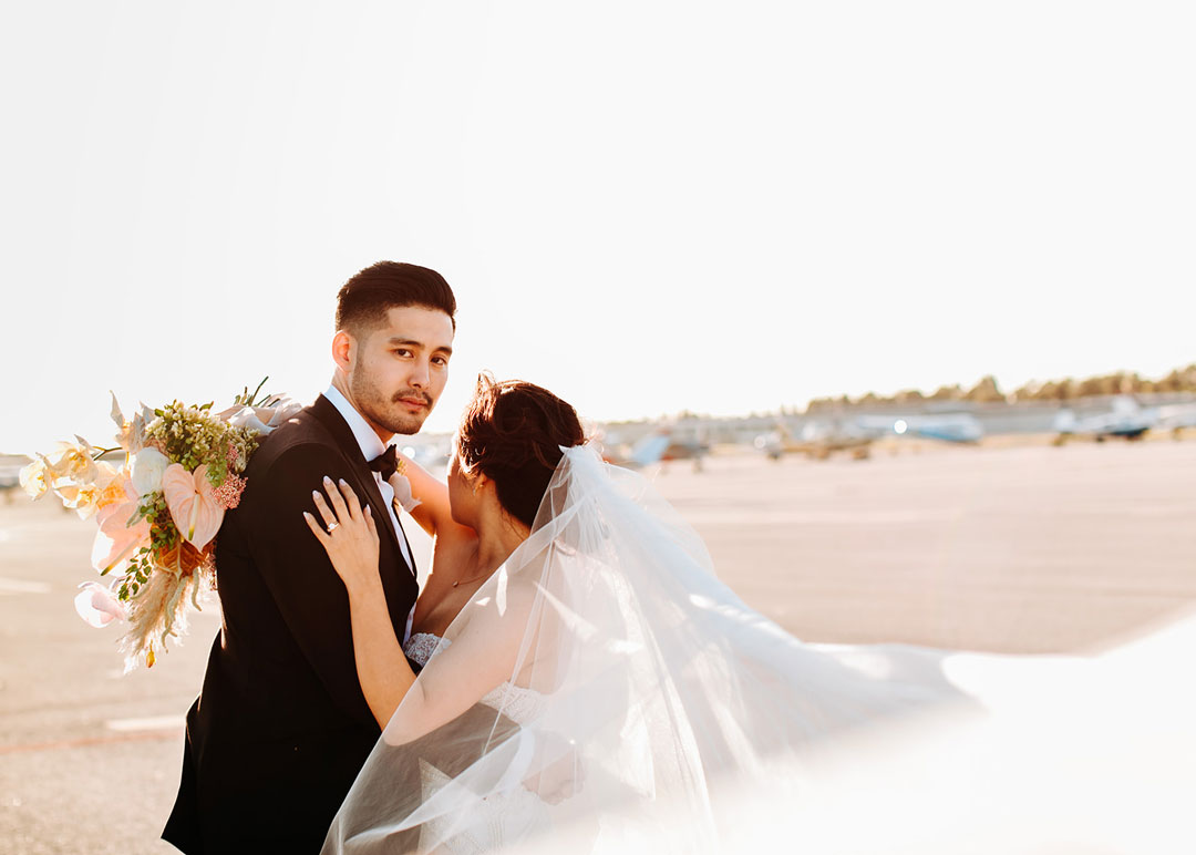 Venue: Hangar 21 South // Catering: Jay’s Catering // Photographer: Alexandria Monette // Planning: Fawn Events // Video: Creative Bliss Events // Florist: Rogue and Fox // HMU: Sue Hong & Makeup By Lucky // Dessert: Eat Your Feelings Ice Cream, Desserts By Charla, & Grace and Honey Cakes // DJ & Music: DJ Wrex, Mitchell De Guzman and Cody Dear // Photo Booth: Focus Photo Suites // Paper Goods & Calligraphy: Kelly Design Co. // Rentals: Sig Party Rentals & Circa Rentals