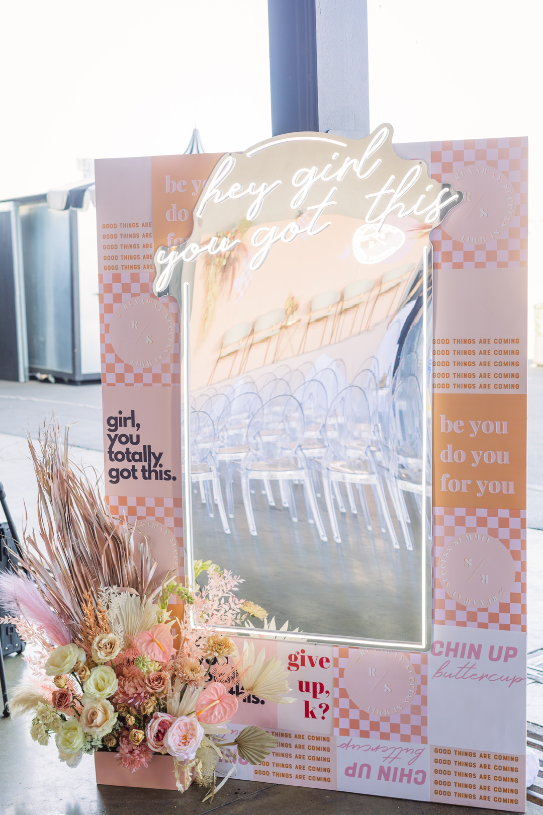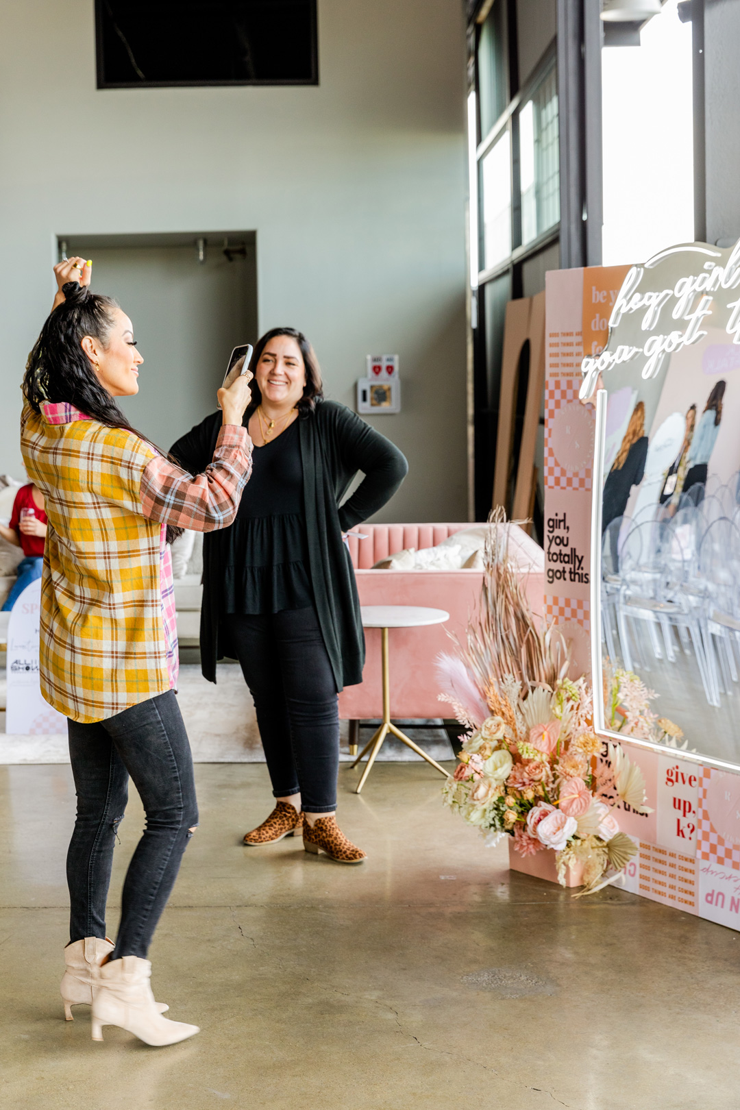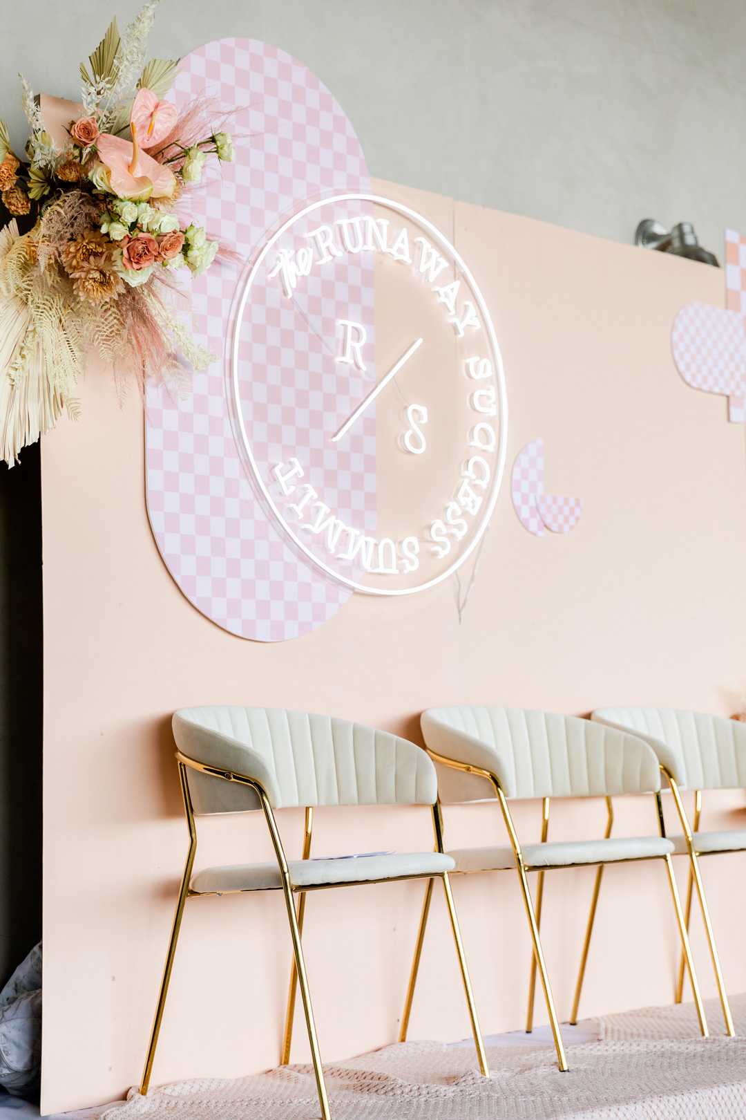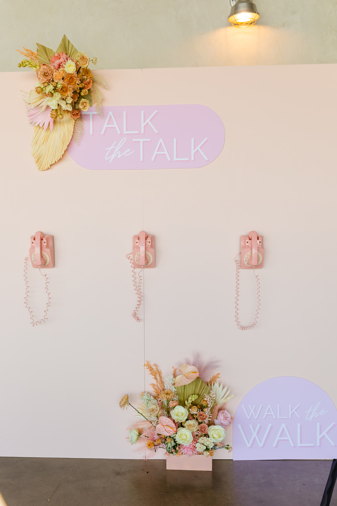 The stage was set at Hangar 21 South for The Runaway Success Summit with host (and speaker) Nikki Anderson-Matthews and guest speakers Jeni Castro, Lindsey Heppner, Christa Paarni, Brooklyn Powell, and Kaylyn Kakuska. A peachy pink backdrop with floral arrangement details and neon Runaway Success Summit sign stood tall behind a row of modern gold chairs awaiting each speaker. Guests arrived and checked in on the side patio at a wooden trolley cart with branded signage surrounding the space. Goody bags filled with little take home treats and stationary items for each attendee were passed out, then guests headed to the tarmac and hangar for the main event. To say that the decor for the Runaway Success Summit was an Instagrammers dream would be an understatement. There were photo moments everywhere! A pink telephone wall with “TALK the TALK” and “WALK the WALK” statements perfectly encompassed this boss babe event. Desert Luna Photobooths made sure to catch all the action here. Right next-door, a magenta shopping cart display filled with peach, ivory, tan and coral flowers made for yet another fun photo activation. But wait, that’s not all! A selfie mirror with neon message, “hey girl you got this,” was propped up by the lounge area and decorated with uplifting phrases and flowers. Marble and gold cocktail tables with matching gold chairs provided casual seating before the event started and Coffee Dose was serving up their famous caffeinated concoctions. As more and more excited attendees filled the venue, the guest speakers took their spots on the stage. Nikki called everyone to take a seat and opened the summit with a thank you and welcome. The speaker panel took off with topics like building a brand, starting a business, networking and more. Personal stories of hardship and success that made each woman who they are today were shared and the speaker panel ended with words of encouragement. Once the panel ended, guests were free to stick around and continue networking or head out for the evening.
