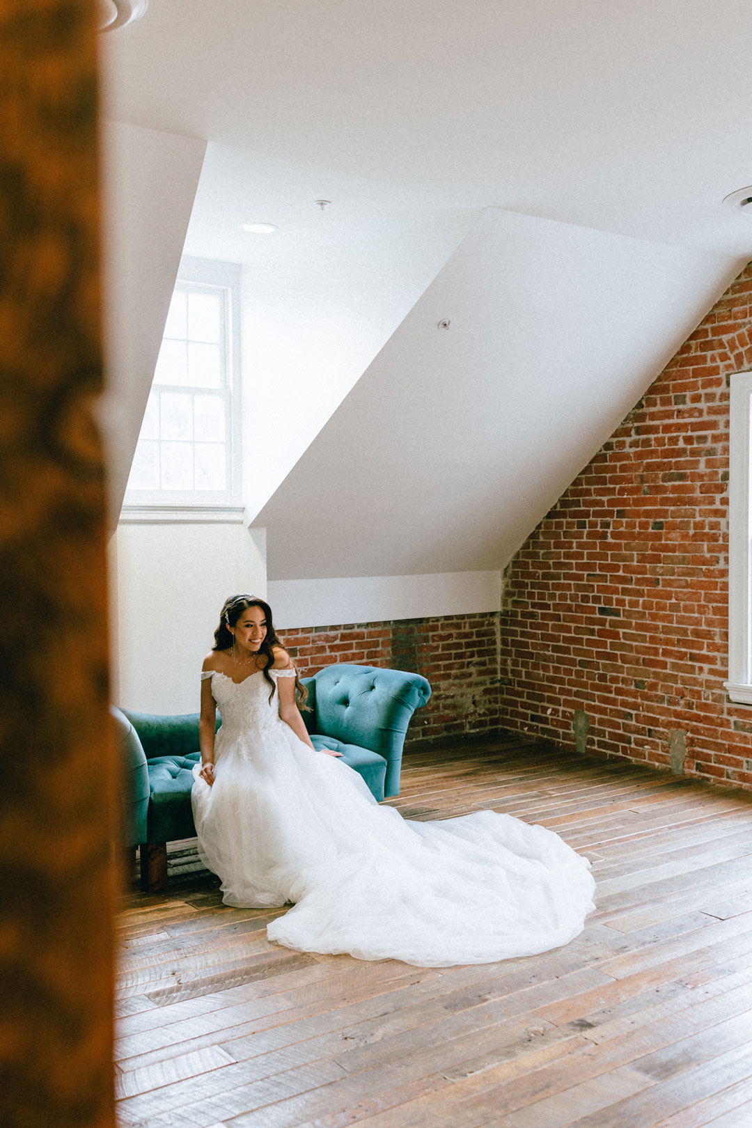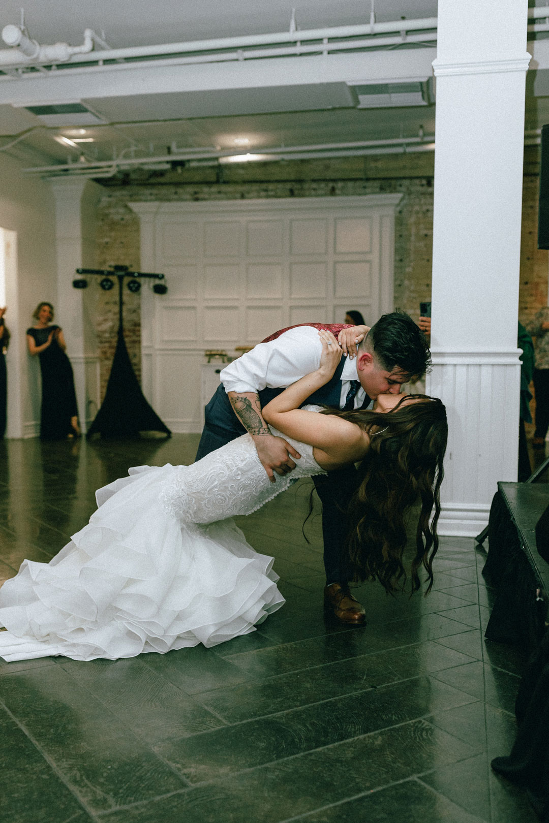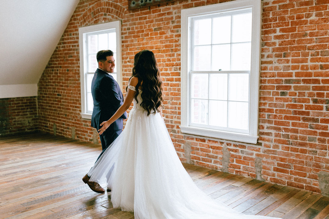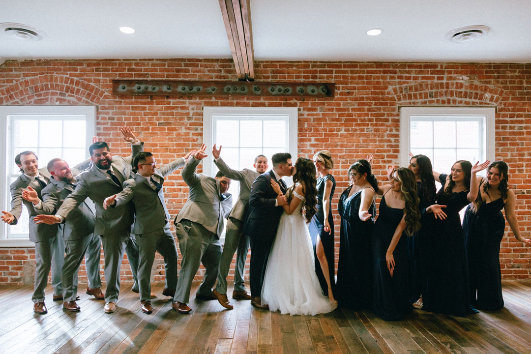 Brittany and her bridal party added the finishing touches to their wedding attire upstairs at The Estate on Second before Kenny and the groomsmen arrived. Each girl was dressed in a different style black dress, some had lace, and some had sequins. The bride, Brittany, wore a tulle and lace, off-the-shoulder gown with pearl accessories. The group posed together for photos, then the groom arrived for his and Brittany’s first look. Standing in his charcoal suit, Kenny anxiously awaited a tap on the arm from his bride. Brittany didn’t keep him waiting long before she walked over and placed her hand softly on his shoulder. Kenny turned around and immediately a huge smile filled his and Brittany’s face. After a few twirls and sweet words, the bride and groom were joined by their bridesmaids and groomsmen for pre-ceremony photos. The wedding party paraded around inside and outside the venue, and as soon as guests began arriving, the group lined up for the ceremony.