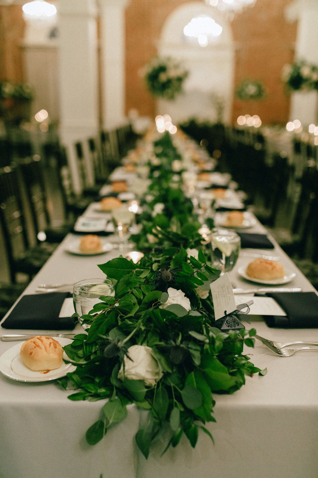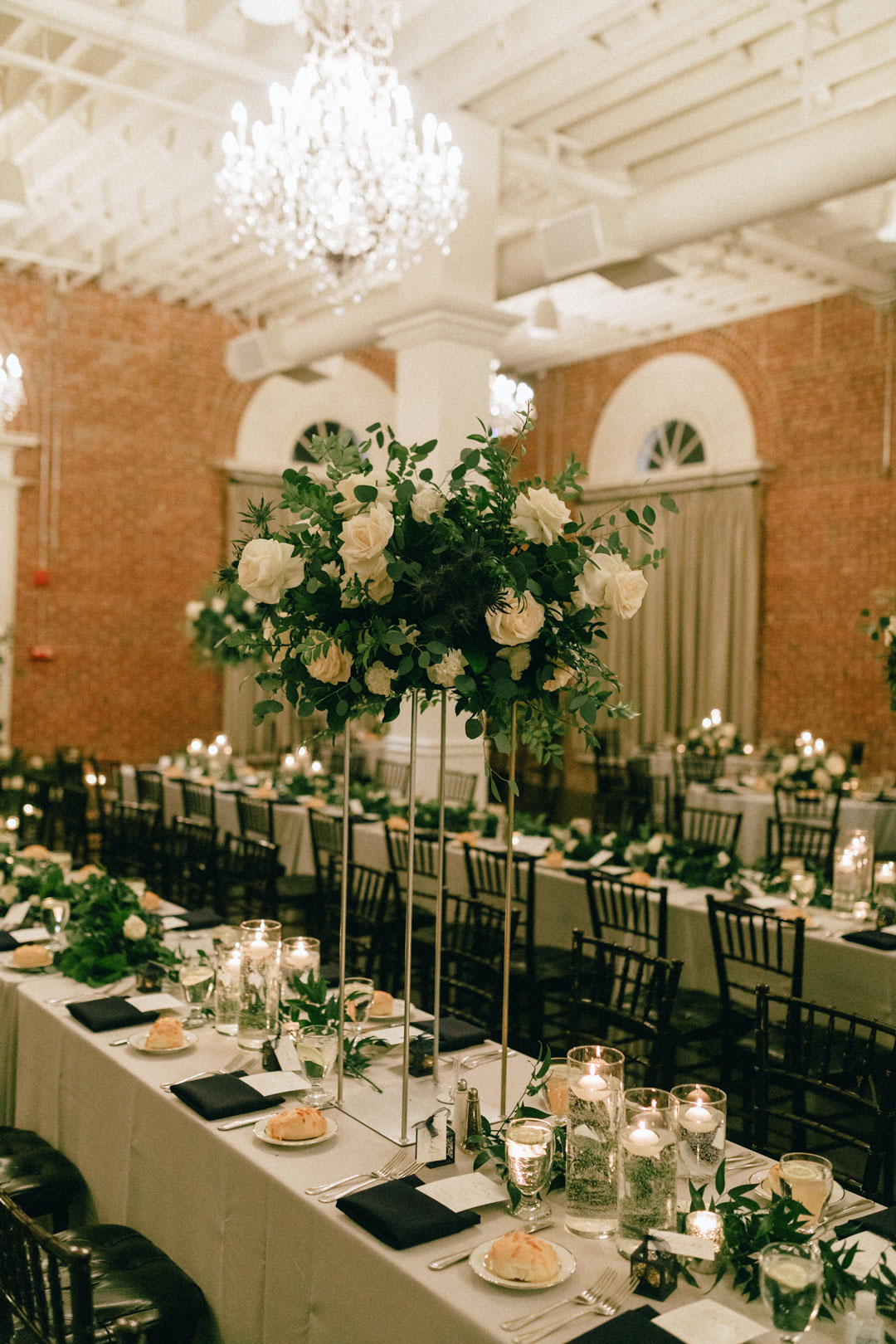 Tables were topped with tall centerpieces of white flowers and greenery was sprinkled between flickering candles. Black napkins were folded to house the evening’s menu and silver flatware was placed on either side. A seating chart led guests to their assigned tables. Kenny and Brittany made their grand entrance as everyone cheered, then they took a seat at their sweetheart table. The first course of Tangerine and Pecan Salad was served around each table as friends and family began sharing toasts. Up next, Classic Filet Mignon and Roasted Atlantic Salmon with Dauphinoise Potatoes closed out the dinner course. The dual entrée menu was selected by the bride and groom with help from our Event Specialist, Casey, during their planning process. Once toasts were done, the bride and groom snuck away for an outfit change. Upon their return, they shared their first dance, cut their wedding cake and invited everyone to indulge in Cookies & Milk Shots and an assortment of cupcakes. On a sugar high, the evening ended with everyone out on the dance floor showing off their best moves.