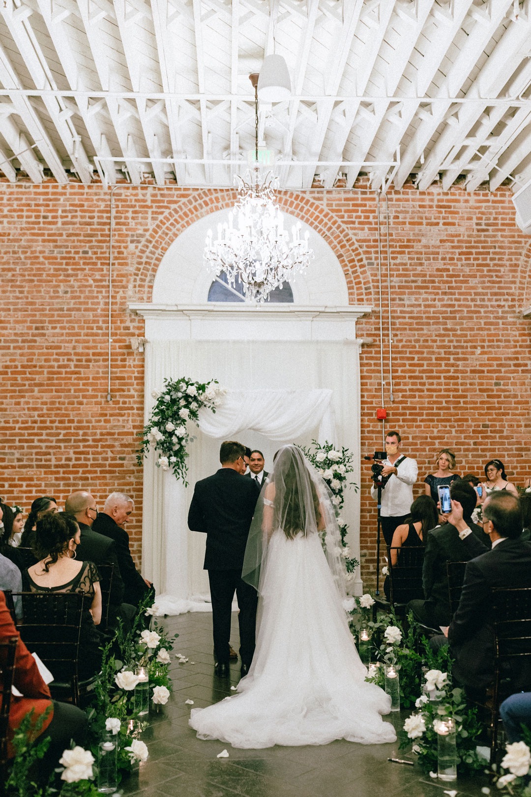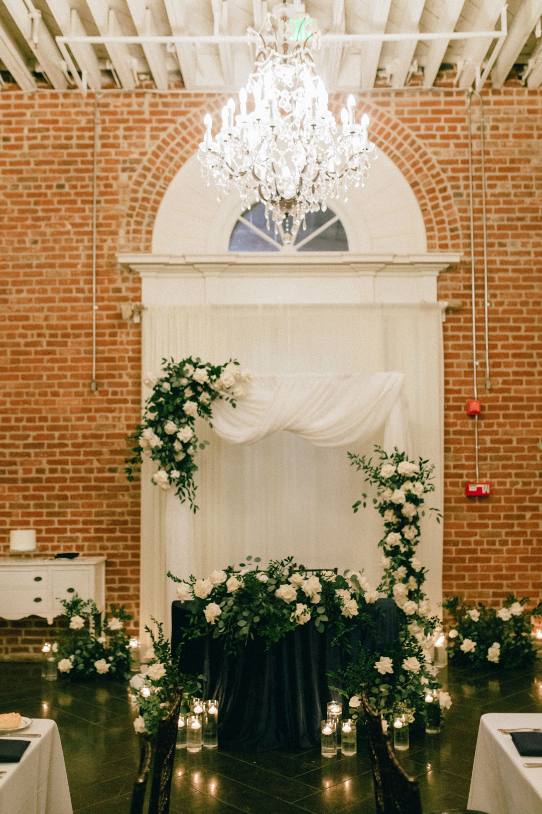 Guests signed Brittany and Kenny’s guestbook before heading inside the Crystal Ballroom where they found a seat. The aisle was lined with greenery and white flowers and a draped arbor stood in front of the center Palladian window decorated in the same green and white color scheme. Once everyone had arrived, live music began playing and the wedding party made their entrances ending the processional with Brittany. In front of family and friends, the bride and groom recited vows, exchanged rings, and sealed the ceremony with a kiss as everyone cheered.