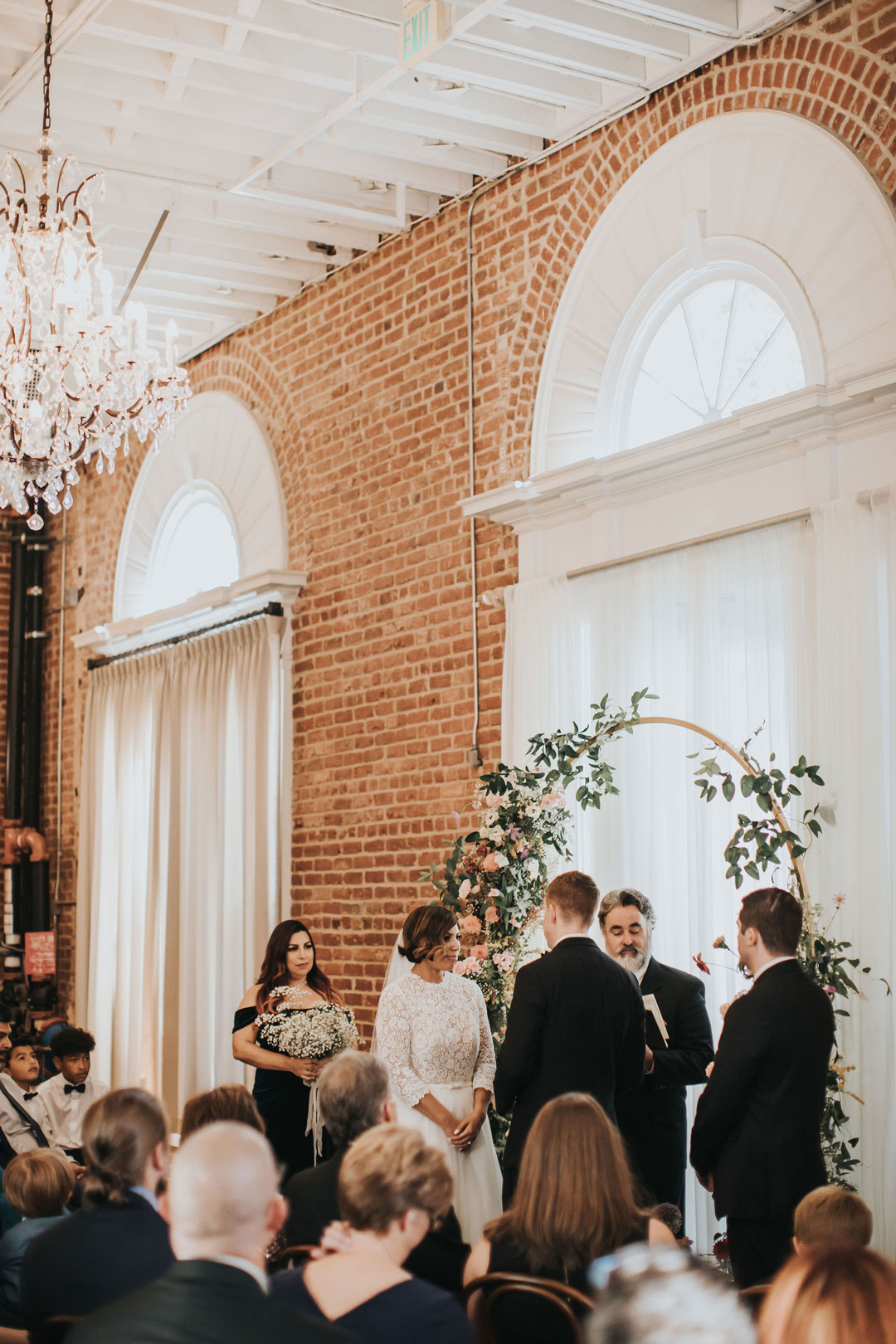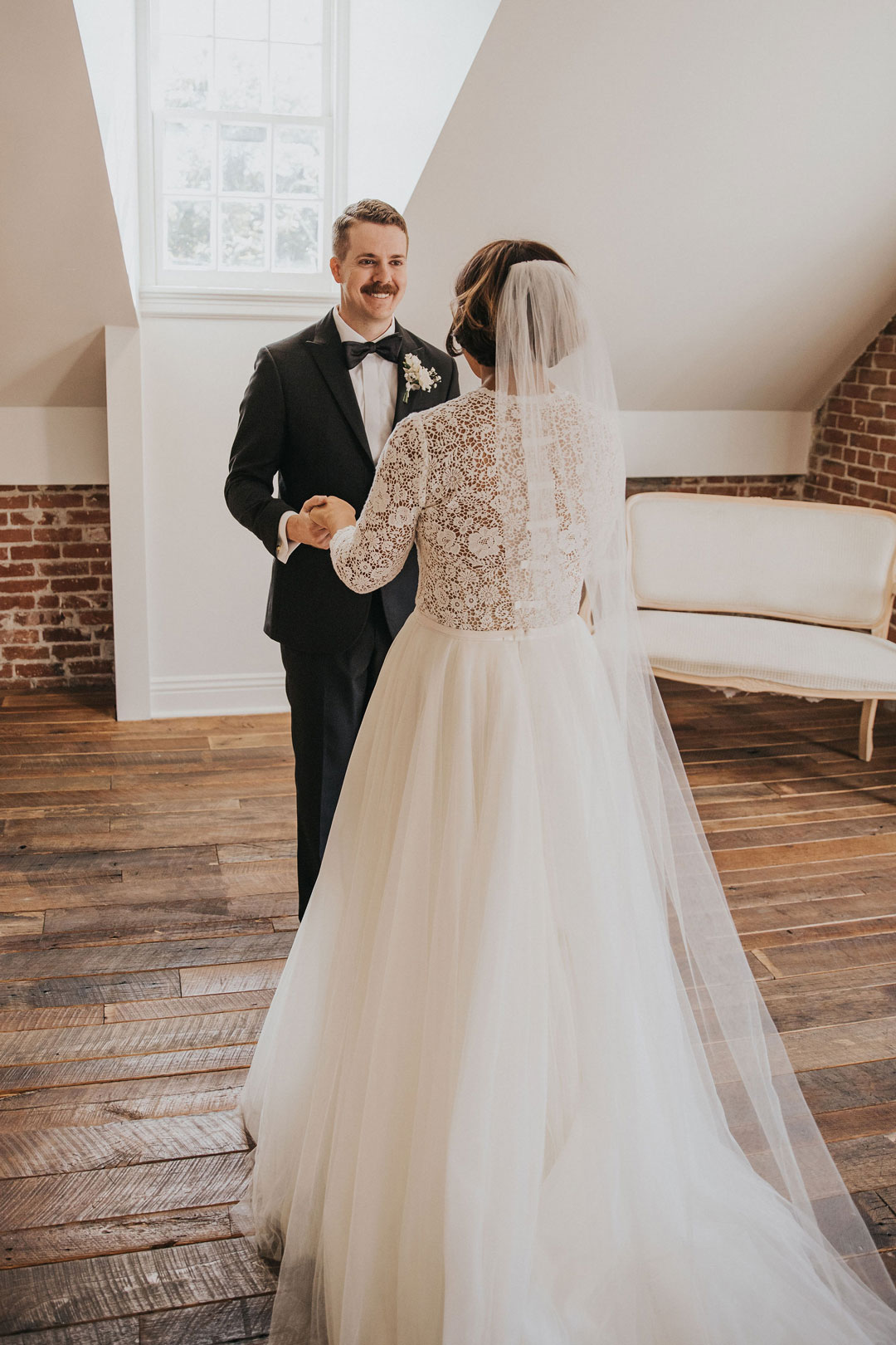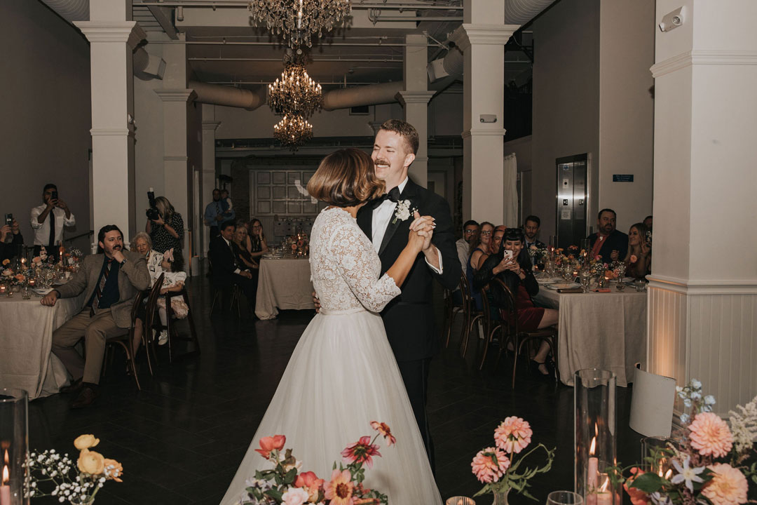Jarrett anxiously awaited Beth upstairs at The Estate on Second while she buttoned up her lace and tulle wedding gown downstairs in the bridal suite. The clicking of her heels could be heard all the way up the stairs as she made her way to her groom, her veil trailing behind her. With a tap on the shoulder, Jarrett turned around and smiled as he saw Beth for the first time that day. The two shared a warm embrace and sweet compliments before the rest of their wedding party joined them after watching from a distance. Family and group photos were taken in the Attic as guests arrived in the Crystal Ballroom just downstairs.