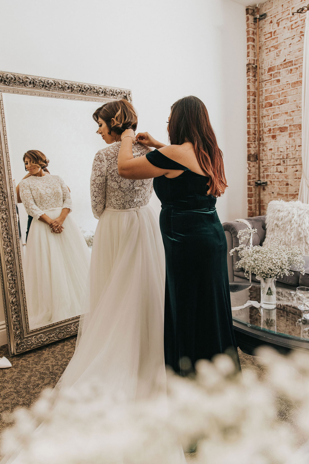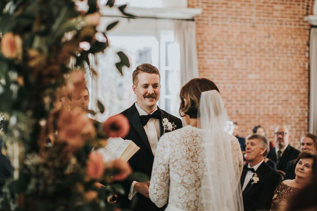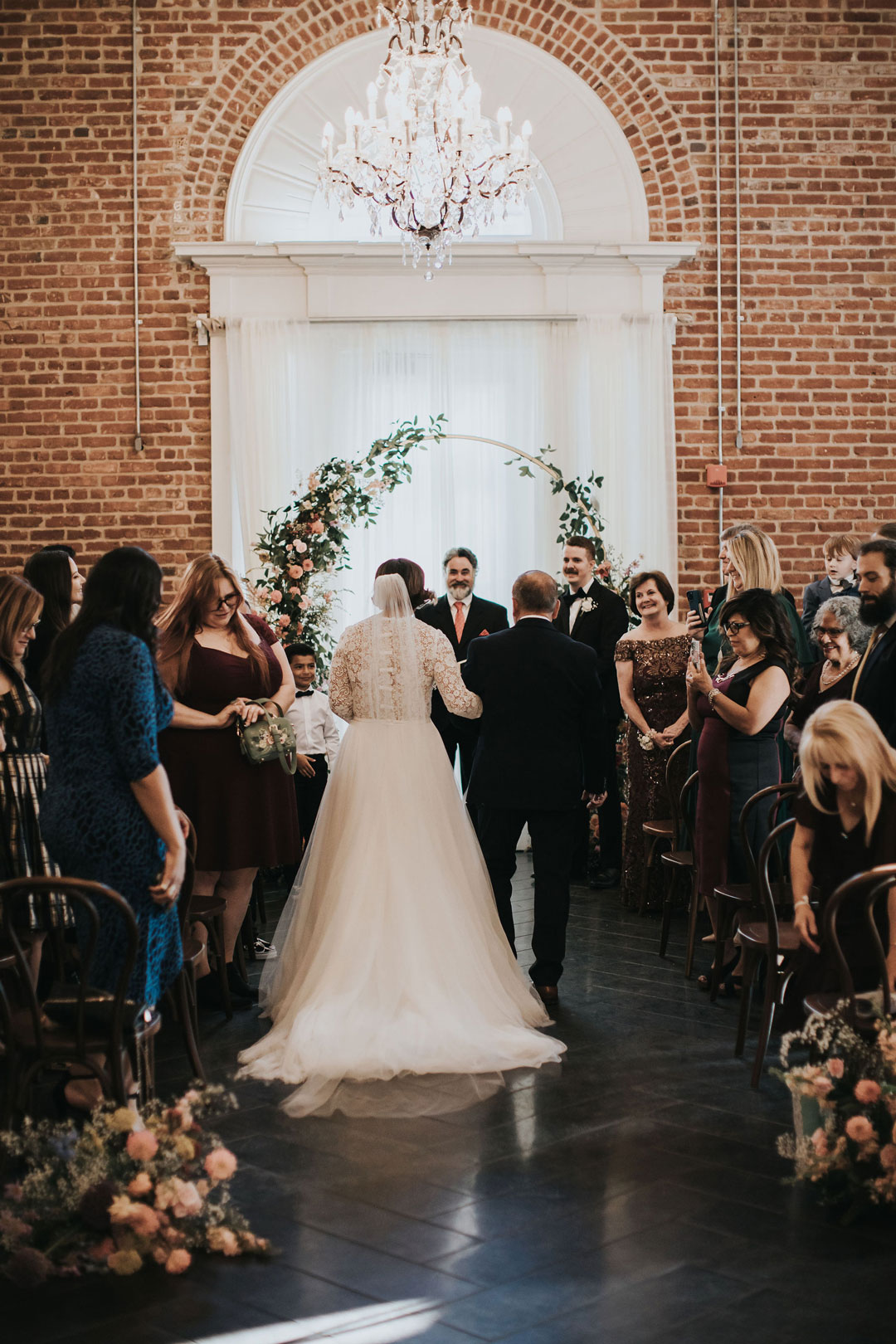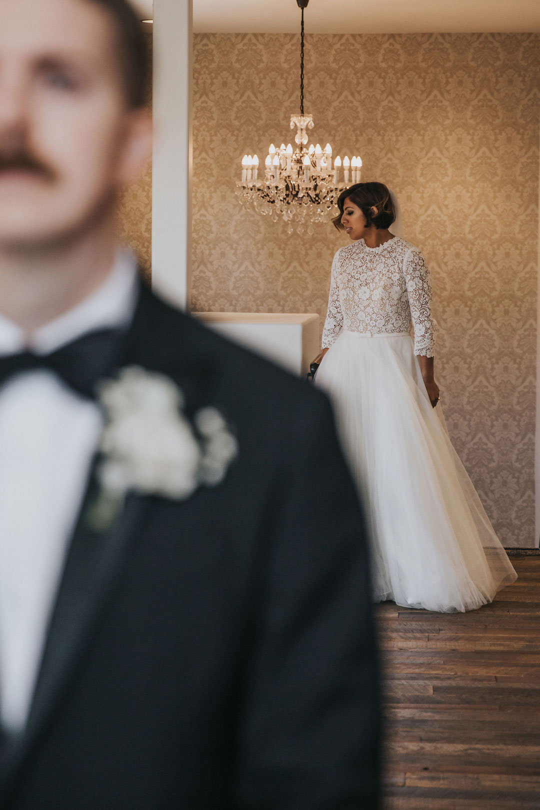 Jarrett anxiously awaited Beth upstairs at The Estate on Second while she buttoned up her lace and tulle wedding gown downstairs in the bridal suite. The clicking of her heels could be heard all the way up the stairs as she made her way to her groom, her veil trailing behind her. With a tap on the shoulder, Jarrett turned around and smiled as he saw Beth for the first time that day. The two shared a warm embrace and sweet compliments before the rest of their wedding party joined them after watching from a distance. Family and group photos were taken in the Attic as guests arrived in the Crystal Ballroom just downstairs.