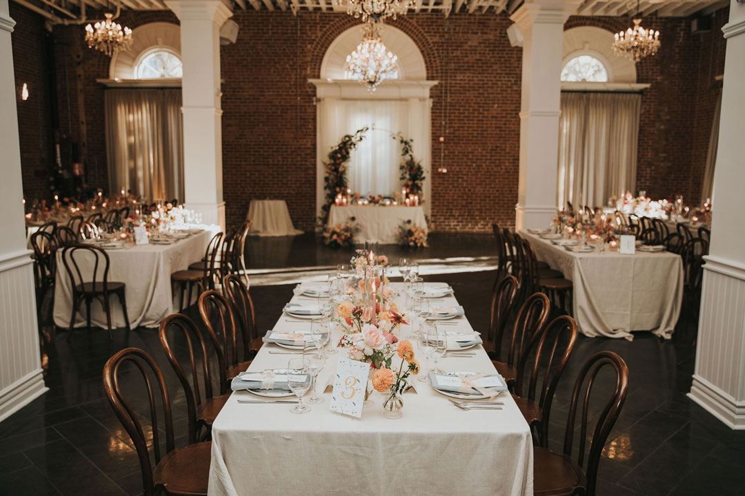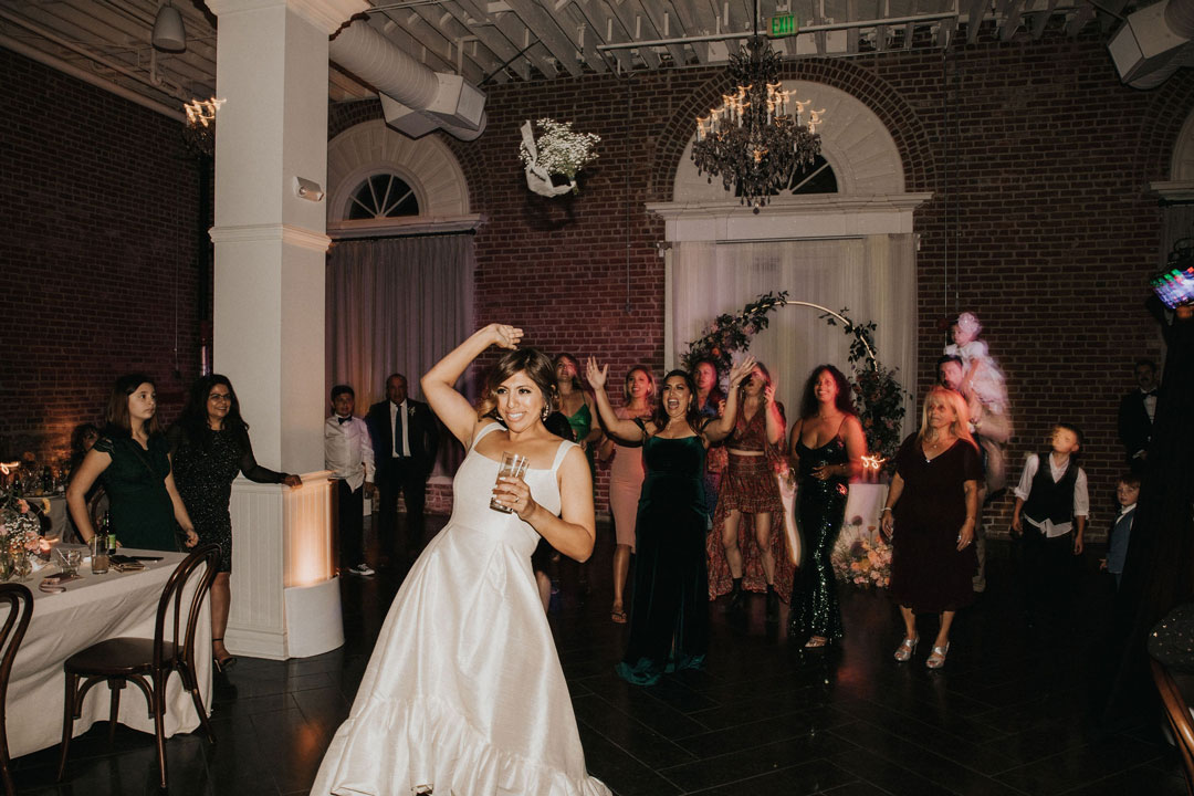Everyone snacked on Blackened Deviled Eggs, Crab Cakes, and Fried Chicken and Waffle Bites during cocktail hour and the bar was serving up the bride and groom’s signature cocktails: A Paloma and Old Fashioned. Beth and Jarrett snuck away from the crowd just for a few minutes to soak in all their newlywed bliss and snap a few photos together before rejoining their guests just in time for dinner. Everyone stopped by the seating chart and found their way back to the Crystal Ballroom.