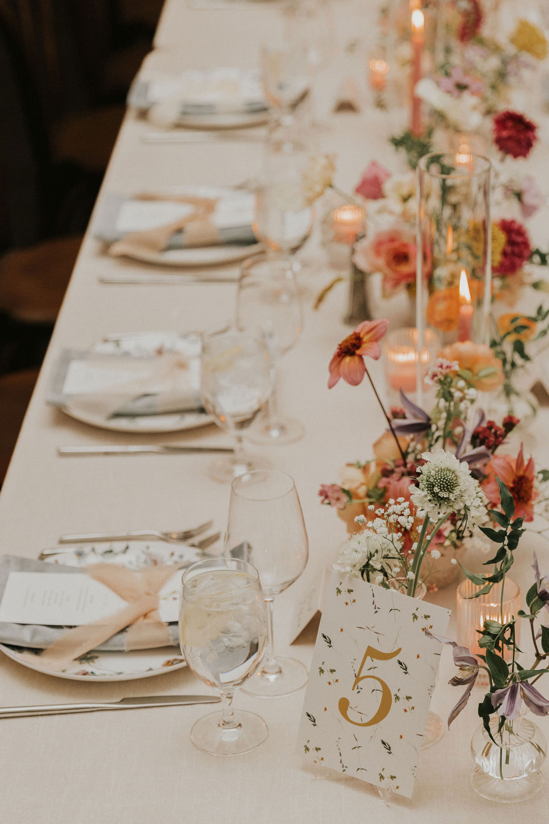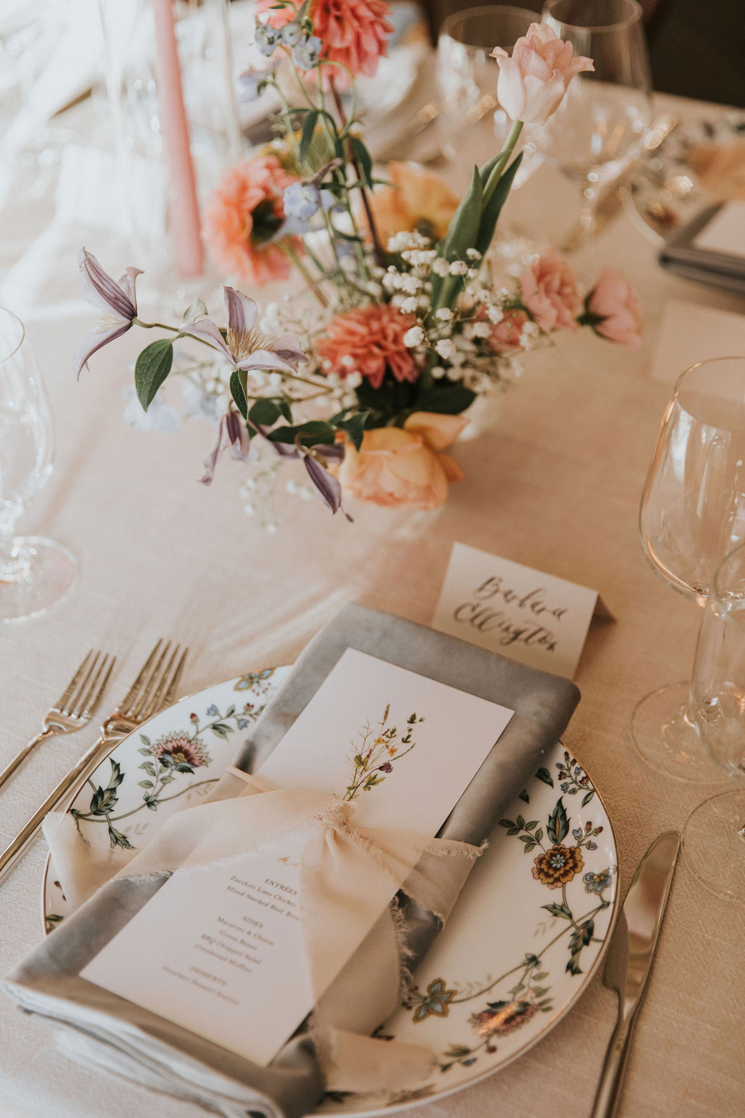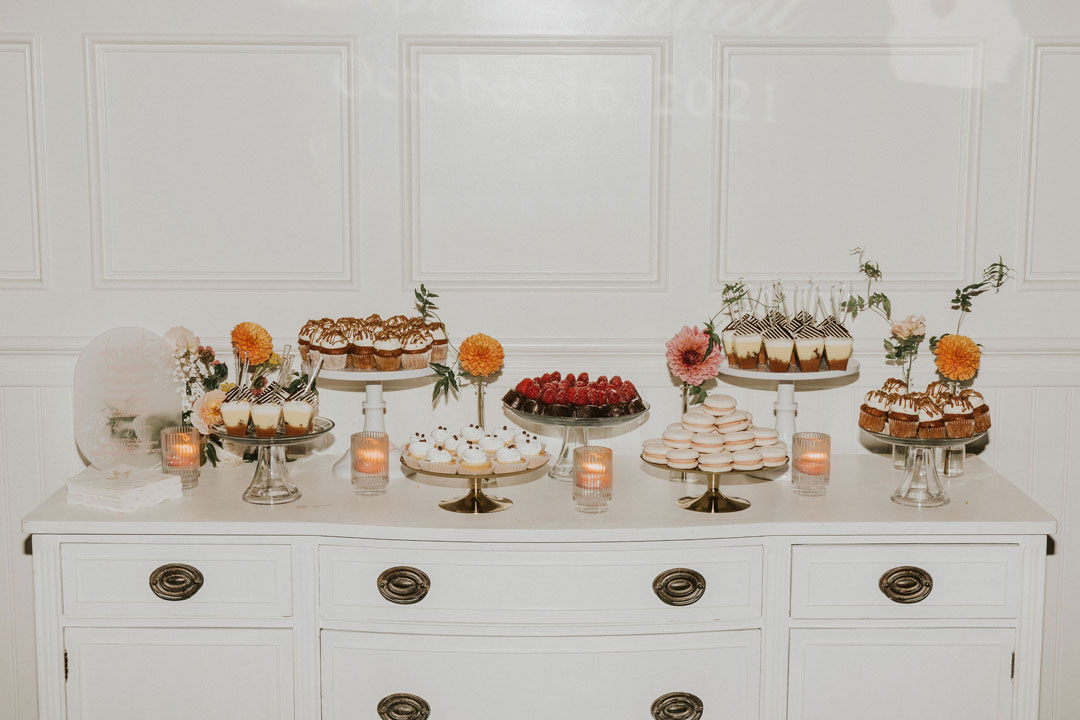 Whimsical table settings including floral plates, custom menus, and colorful candlesticks added a vibrance to the white linens they sat upon. Wildflower floral arrangements were scattered atop the center of each table and matched the table number signs. Once everyone had found their seat, the bride and groom made their grand entrance, shared their first dance, and took a seat at the sweetheart table. Friends and family toasted to the newlyweds filling the room with laughter and happy tears, then dinner was served. Zucchini Lime Chicken, Sliced Beef Brisket, Macaroni and Cheese, Green Beans, BBQ Chopped Salad, and Corned Bread Muffins with Honey Butter were on the menu that was selected by Beth and Jarrett with help from our Event Specialist, Sierra, during the couple’s planning process. When dinner was almost done, all the single ladies got called out to the dance floor. Beth tossed her baby’s breath bouquet and a hopeful friend caught it. Next, the bride and groom cut into their 3-tiered white cake with raspberry creme filling. Guests were able to indulge in cake and an assortment of sweets from our Gourmet Dessert Station including Mini Lemon Curd Tarts, Berry Champagne Macarons, Raspberry Chocolate Decadence, Mini Carrot Cupcakes, and Caramel Cream with Lemon Curd and Praline Crisp Dessert Shots. Once everyone had filled up on sweets, the evening ended out on the dance floor.