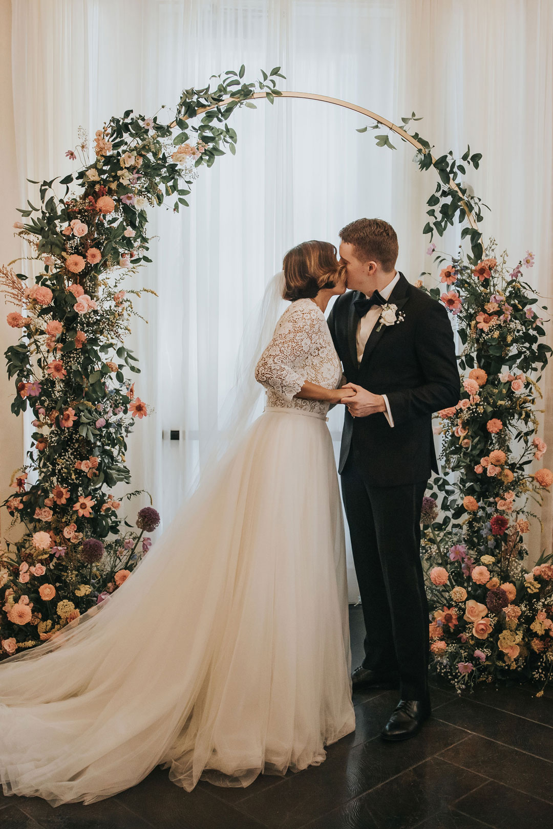 Purple, peach, blue and yellow flowers climbed up a metal arch in front of the center Palladian window inside the Crystal Ballroom and two floral arrangements marked the start of the aisle where the bride and groom would soon be walking. Guests entered through the Veranda and took a seat, then the wedding party made their entrances ending with the bride, Beth. Vows and rings were exchanged and everyone stood as the newlyweds shared a kiss and exited their ceremony after being pronounced husband and wife.